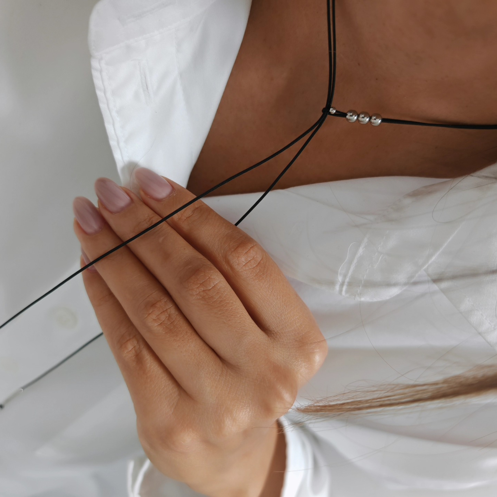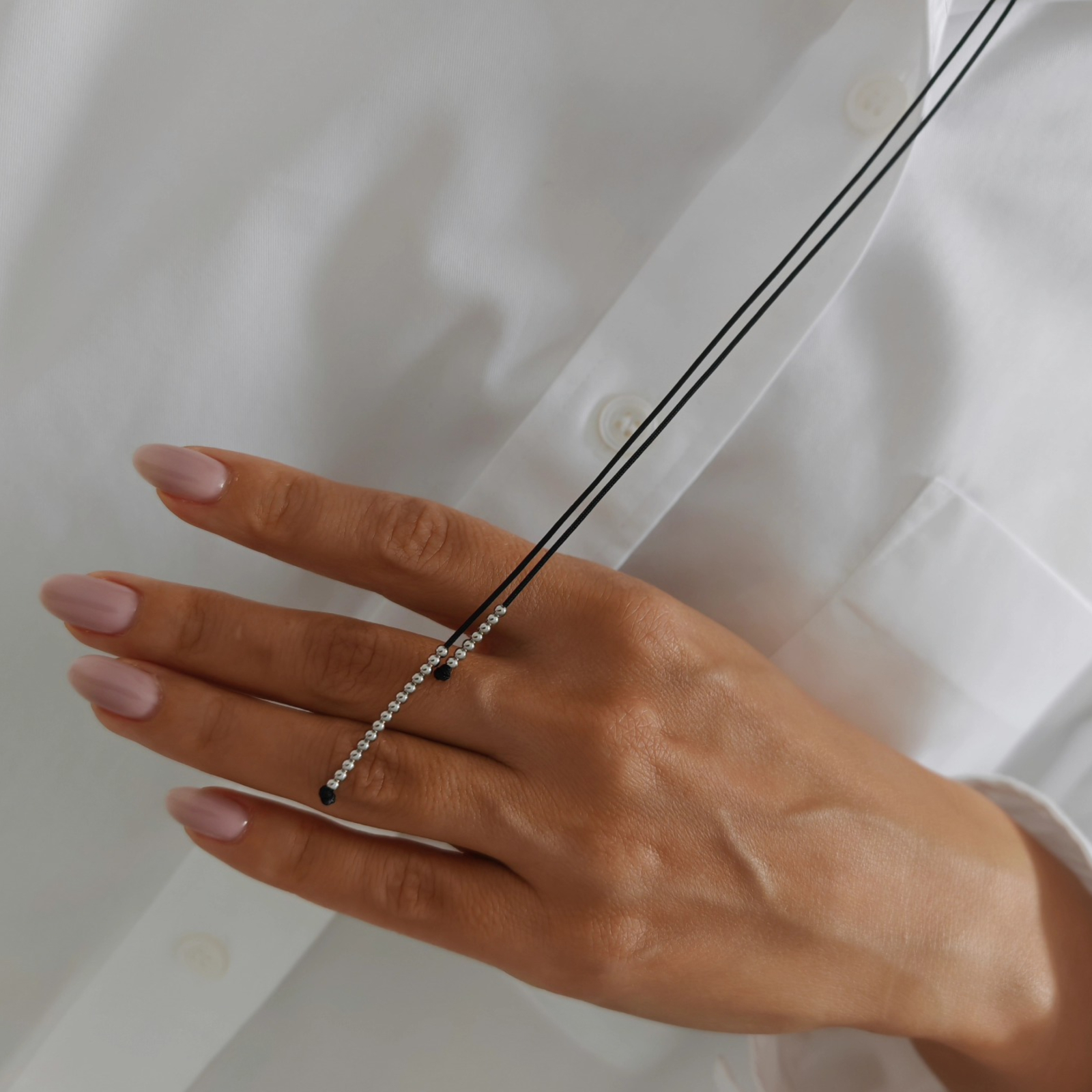 Colier snur negru cu bilute din argint 925 rodiat, un accesoriu elegant si versatil. Acest colier snur minimalist este ideal pentru tinute moderne si poate fi purtat atat singur, cat si in combinatie cu alte bijuterii.