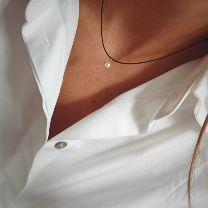 Un simbol delicat al purității și eleganței, acest colier cu șnur reglabil și pandantiv din perlă naturală și mini bănuț din aur galben de 14K este o bijuterie fină, ușor de purtat zi de zi sau oferit cadou. Designul minimalist pune în valoare frumusețea naturală a perlei și strălucirea discretă a aurului.
