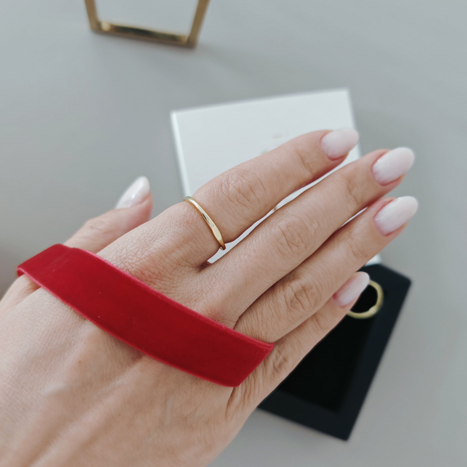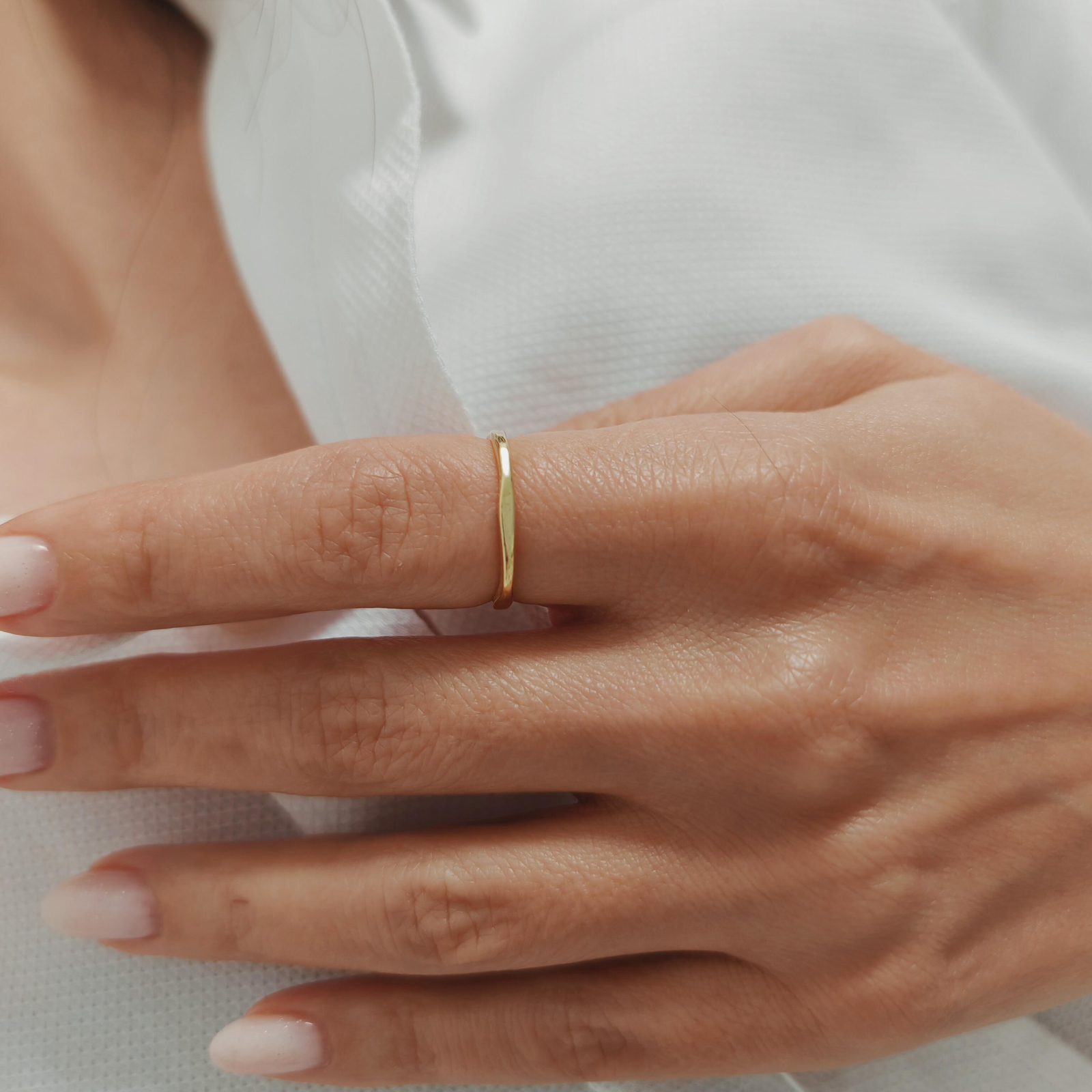 Textura hammered oferă reflexii subtile și un efect vizual interesant, în timp ce forma geometrică păstrează linia minimalistă a bijuteriei. Este un model versatil, potrivit pentru purtare individuală sau în combinații cu alte inele.