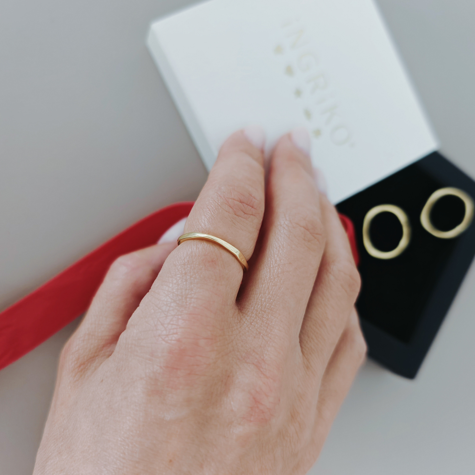 Inel geometric din argint 925 placat cu aur, finisaj hammered creat pentru un stil modern și minimalist, perfect pentru purtare zilnică. Designul său simplu, dar distinct, îl face ușor de asortat și ideal pentru a completa orice colecție de bijuterii contemporane.