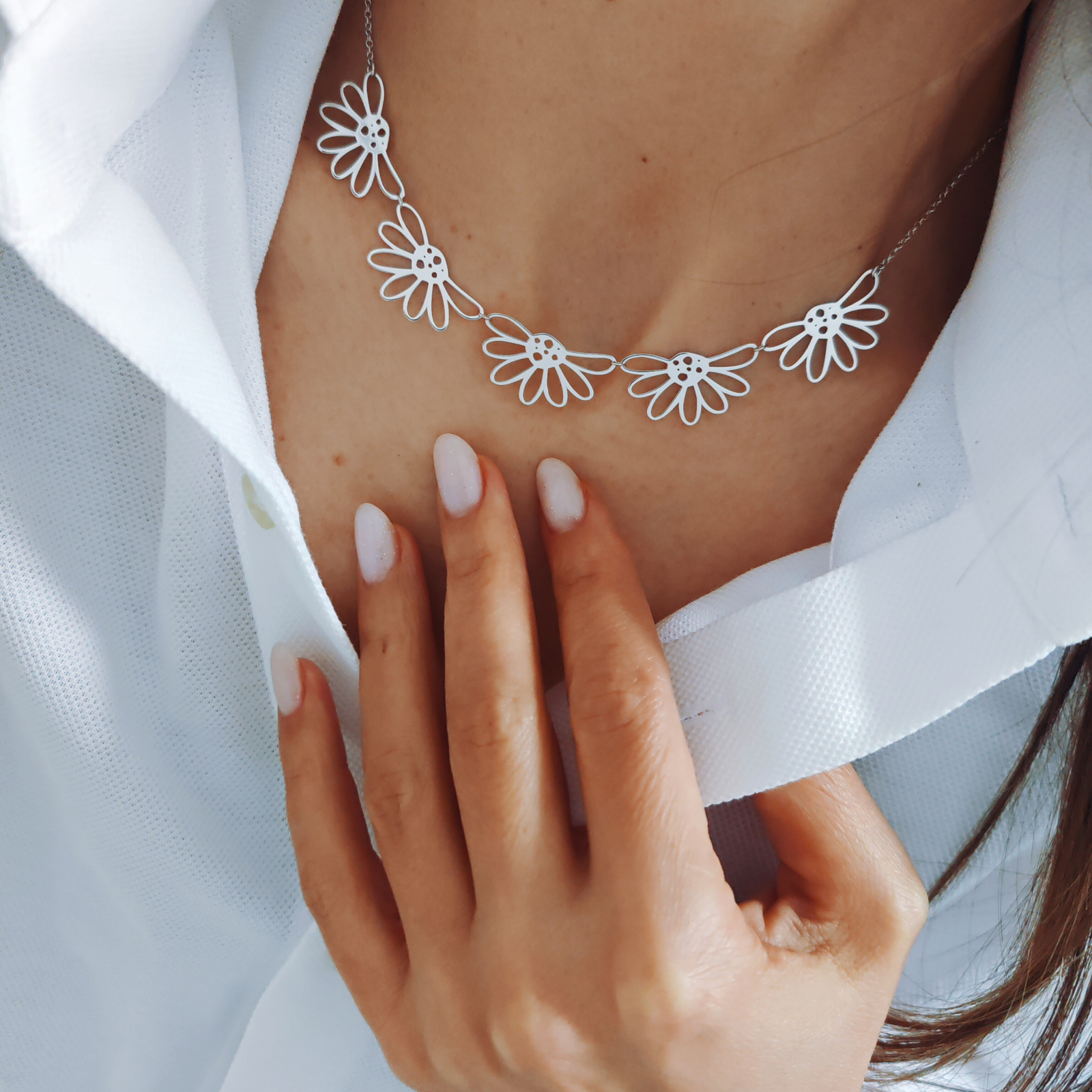 Delicat, elegant si usor de purtat zilnic, lantisorul la baza gatului din argint 925 rodiat Flora este piesa perfecta pentru un look feminin si rafinat. Designul floral fin adauga un accent subtil de eleganta, ideal atat pentru tinutele de zi, cat si pentru ocazii speciale.