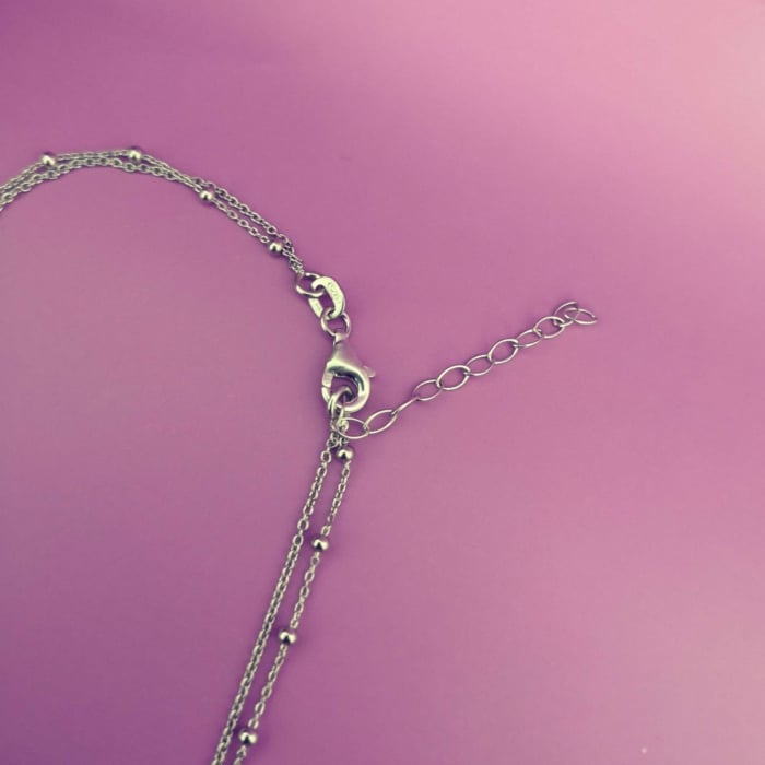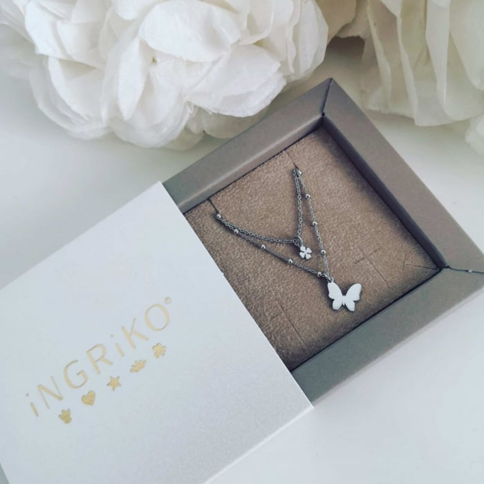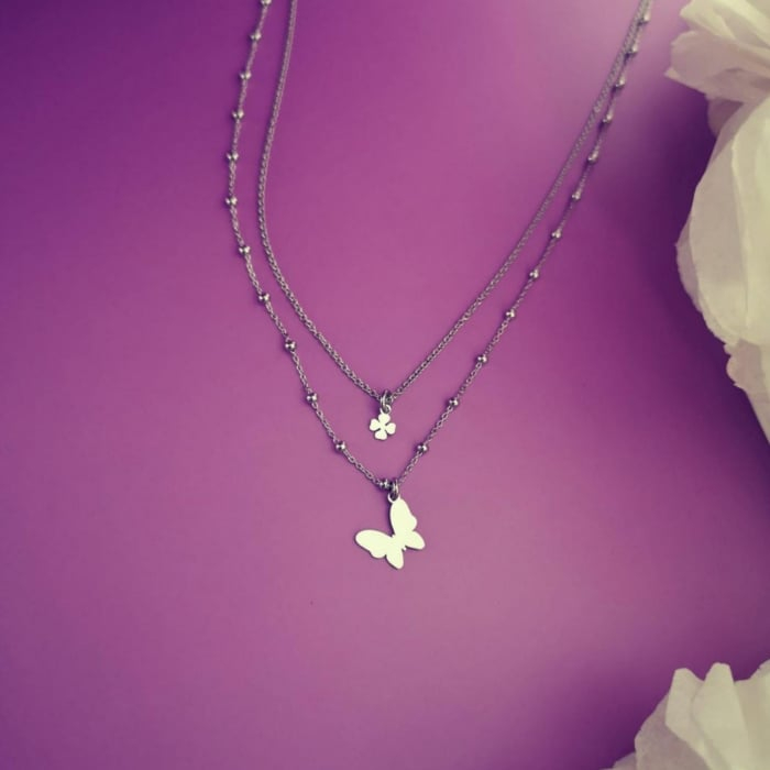 Acest colier dublu combina doua lanturi fine cu talismane din argint, oferind un efect vizual rafinat. Fluturele are dimensiunea de 1 cm, iar trifoiul 0,4 cm, creand un accesoriu discret dar plin de simbol.
